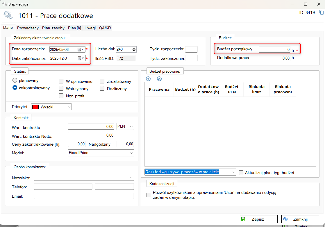 Pojawi się panel edycji etapu, w którym należy zdefiniować elementy oznaczone czerwoną gwiazdką: