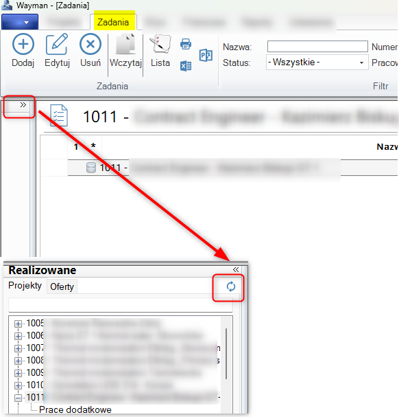 Jeśli świeżo założony etap nie jest widoczny w zakładce zadania, należy odświeżyć listę projektów, w miejscu wskazanym poniżej:
