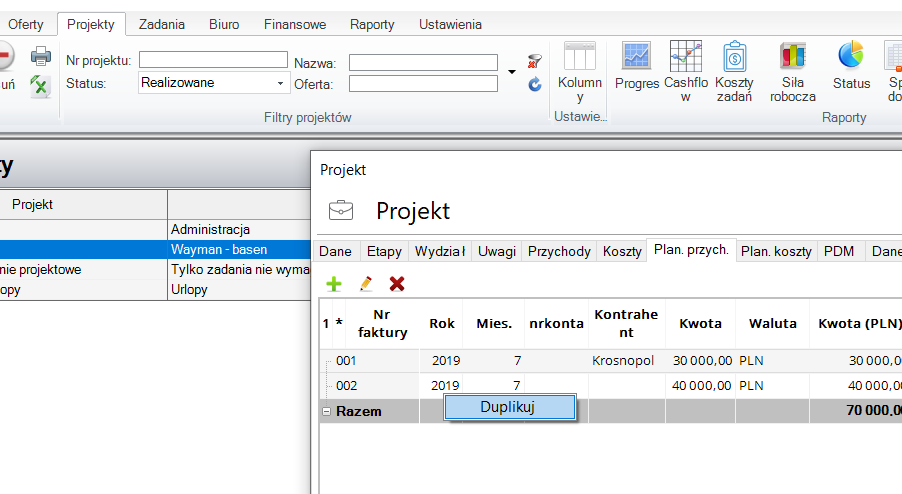 1. Planowane przych/koszt w karcie projektu/etapu - funkcja duplikuj