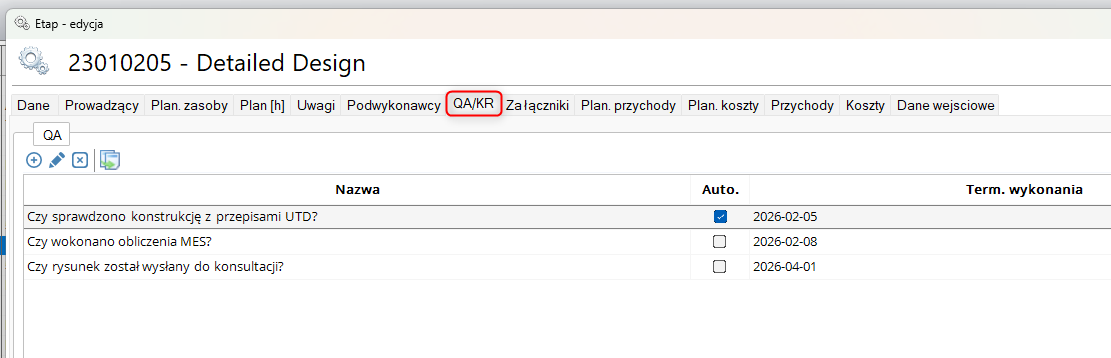 Należy edytować żądany etap i przejść do zakładki ‘QA/KR’: