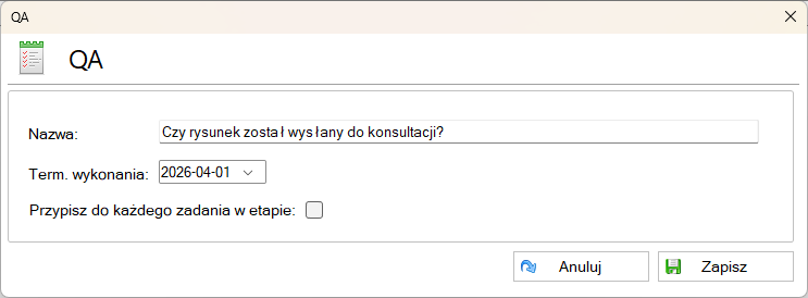 Listę czynności sprawdzających (QA) można zdefiniować dla konkretnego zadania bądź przygotować