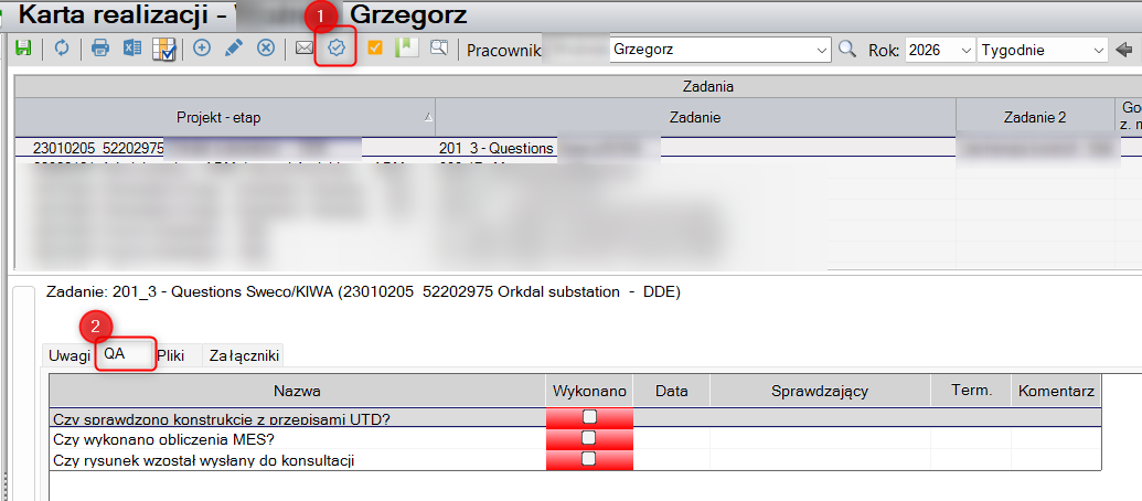 Raport daje możliwość wyboru interesującego nas projektu i weryfikacji, czy wszystkie QA zostały wykonane (kolumna ‘QA’). Jeśli QA zostały wykonane częściowo można edytować zadanie klikając prawym klawiszem myszy->’Edytuj’ albo używając symbolu ołóweczka (znajduje się nad listą zadań). W panelu zadania należy przejść do zakładki ‘QA’, gdzie możliwa jest weryfikacja szczegółowa. Jeśli zadanie nie ma wykonanych wszystkich czynności QA, PM może zmienić status zadania z ‘Do sprawdzenia’ na ‘Wykonywane’ (w panelu zadania), kierując zadanie do wykonawcy celem dokończenia.
