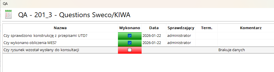 Raportowanie czynności QA polega na zaznaczeniu odpowiedniego kwadracika w kolumnie ‘Wykonano’ - zaznaczenie oznacza wykonanie danej czynności. Wówczas system zapisuje wykonawcę oraz datę wykonania czynności. W kolumnie ‘Komentarz’ możliwe jest pozostawienie notatki.