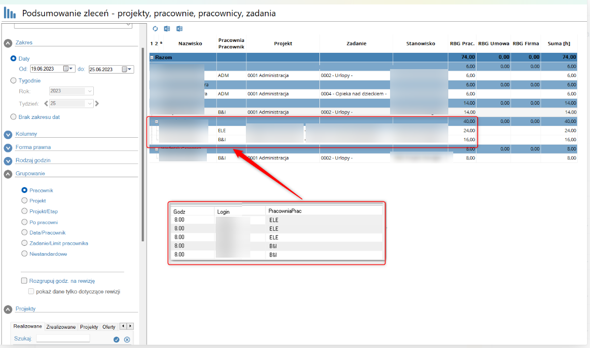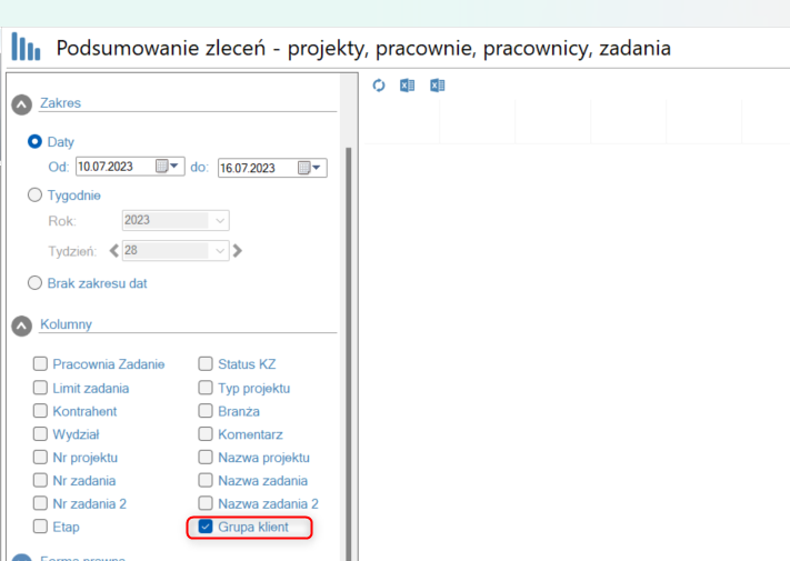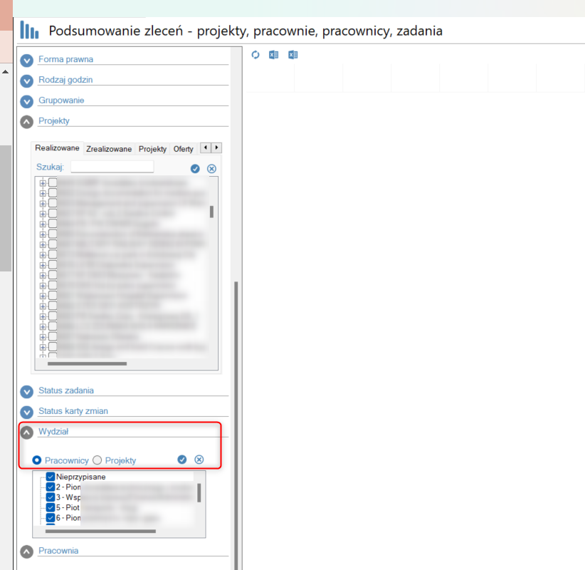 1. Modyfikacje w raporcie "Podsumowanie zleceń - projekty, pracownie, pracownicy, zadania"