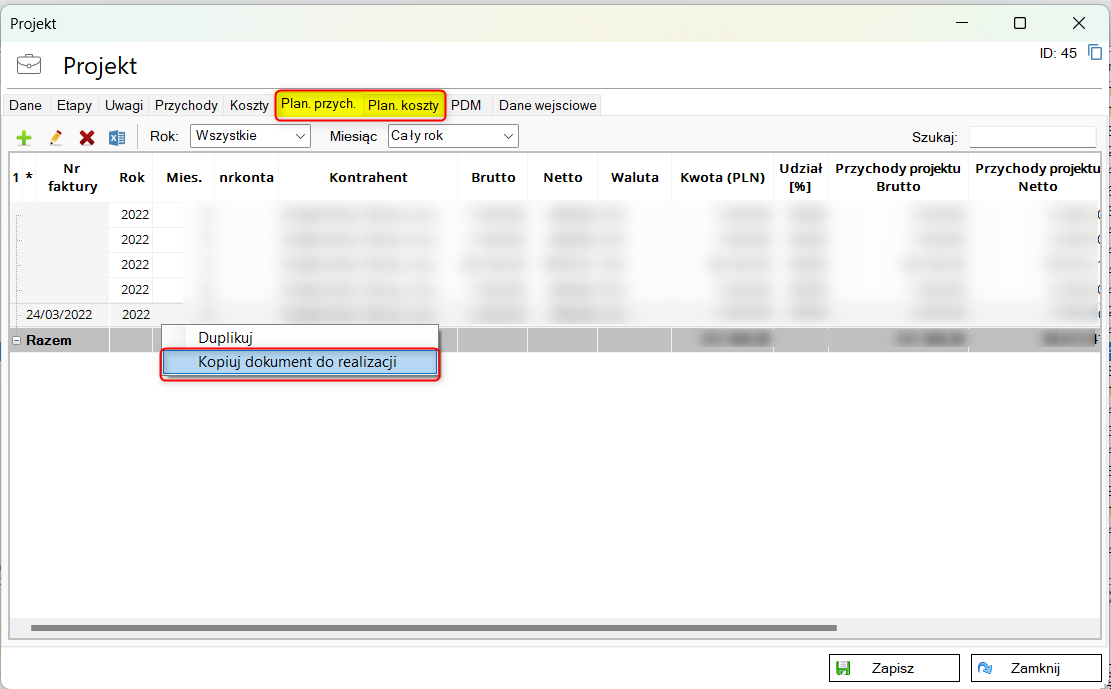W planowanych kosztach i przychodach dodano funkcję 'Kopiuj do realizacji: