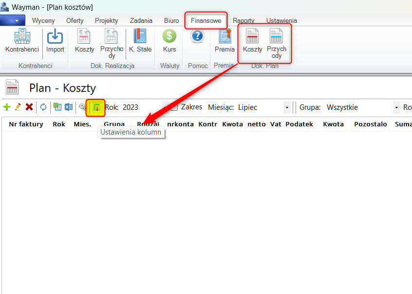 W module Finansowe, zakładka Dokumenty planowane, dodano klawisz "Ustawienia kolumn"