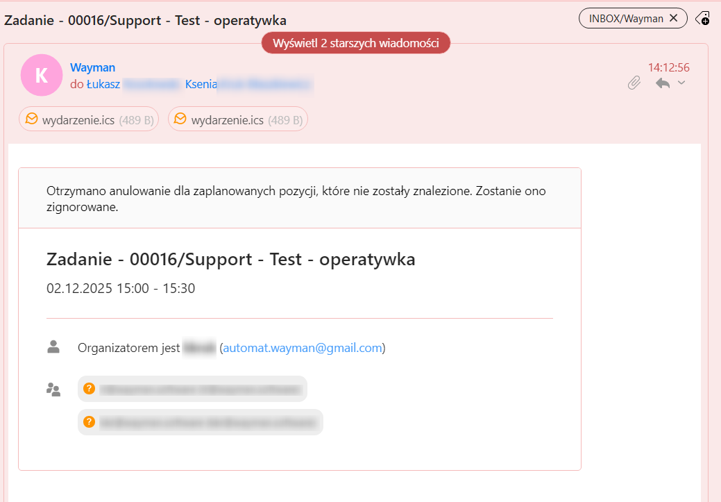 Gdy usuniemy wydarzenie z aplikacji, zostanie ono anulowane w kalendarzu: